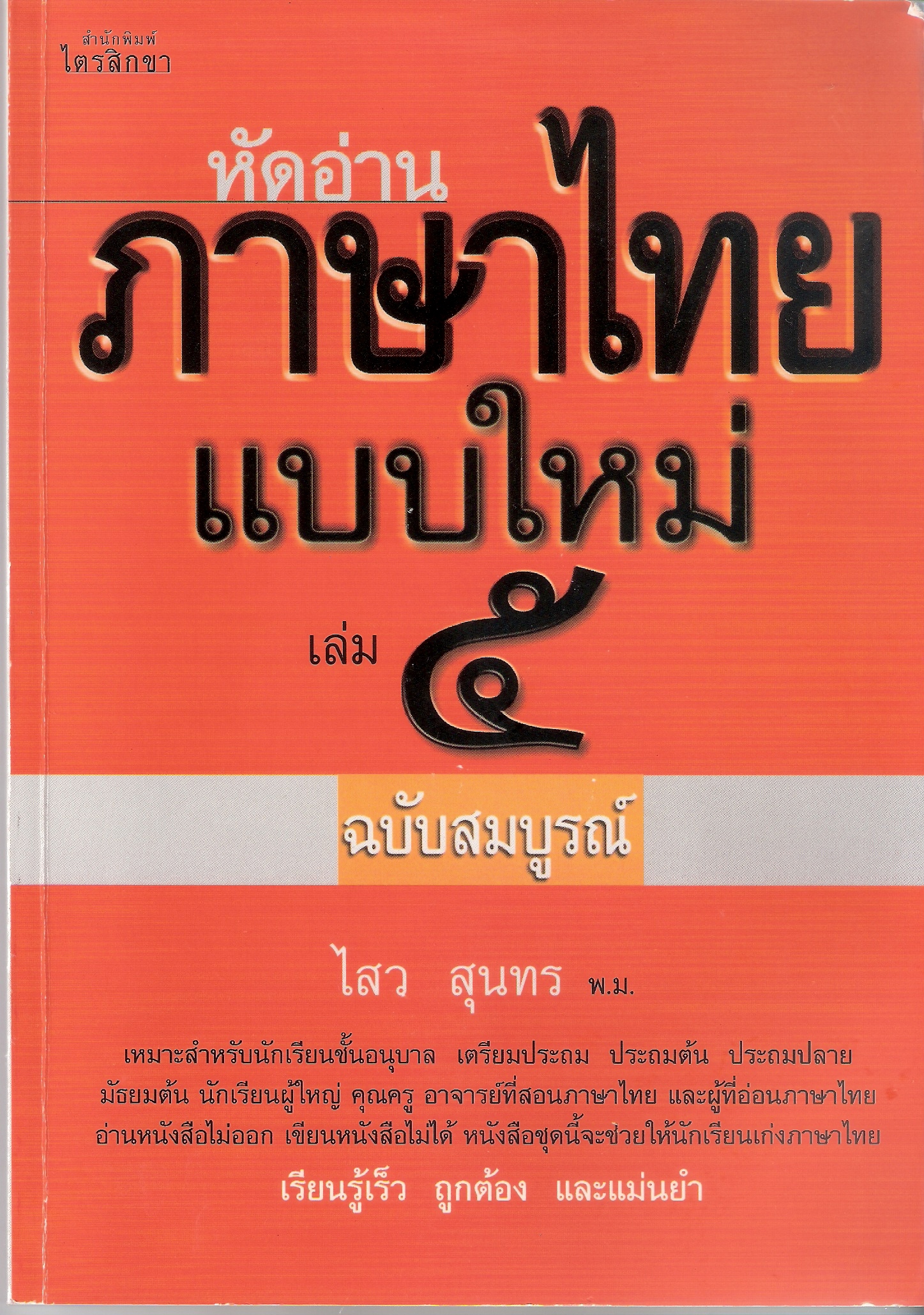 หัดอ่านภาษาไทยแบบใหม่ [Learning to Read Thai the New Way] Volumes 1-7 by ไสว สุนทร [Suwai Suntorn], ISBN Volume 1: 974-90393-3-5, 50 baht; Volume 2, 974-90394-4-3, 50 baht; Volume 3, 974-90740-7-6, 60 baht; Volume 4, 974-93172-7-0, 100 baht; Volume 5, 978-974-623-778-9, 100 baht; Volume 6, 978-974-13-6198-4, 105 baht; Volume 7, 978-974-05-3290-3, 110 baht.