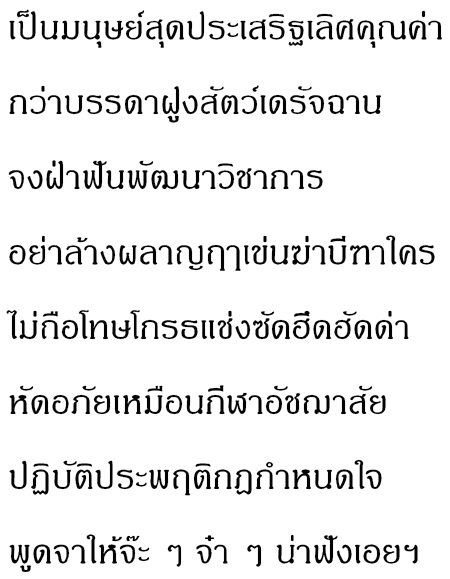 ![]() font name: JasmineUPC | เป็นมนุษย์สุดประเสริฐเลิศคุณค่า กว่าบรรดาฝูงสัตว์เดรัจฉาน จงฝ่าฟันพัฒนาวิชาการ อย่าล้างผลาญฤๅเข่นฆ่าบีฑาใคร ไม่ถือโทษโกรธแช่งซัดฮึดฮัดด่า หัดอภัยเหมือนกีฬาอัชฌาสัย ปฏิบัติประพฤติกฎกำหนดใจ พูดจาให้จ๊ะ ๆ จ๋า ๆ น่าฟังเอยฯ ![]() ![]() “To be human is most glorious with more value Than herds of animals in the wild You must then work hard to develop your skills Don’t pillage, murder or oppress anyone Don’t hold grudges, be angry, curse or scold Learn forgiveness as you would good sportsmanship Behave within the rule and spirit of the law Speak nicely and sweetly so it is pleasing to the ear.” |